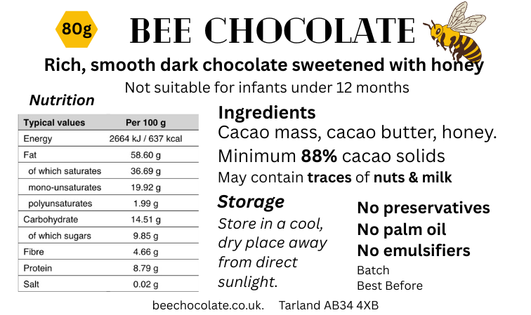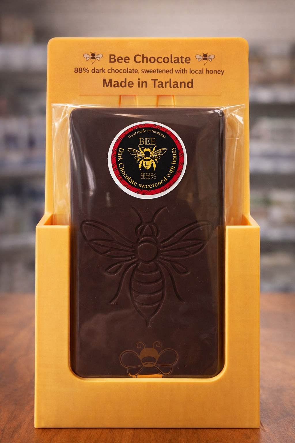 Small-batch 88% dark chocolate, sweetened only with honey. Crafted in Tarland, Aberdeenshire for premium retail and gifting.